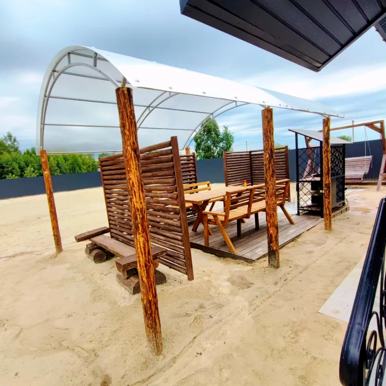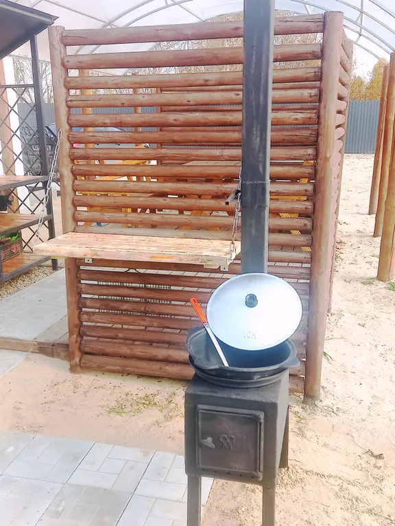 На улице современная мангальная зона с принадлежностями, беседка, стол, лавочки.