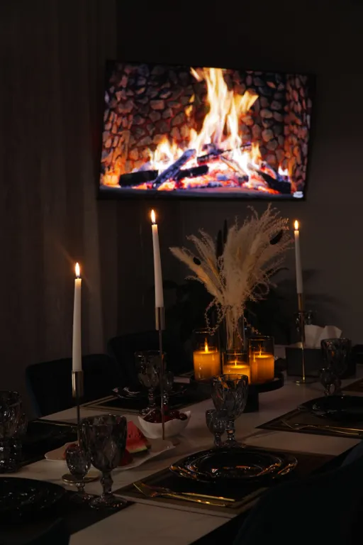 Приборы для сервировки стола: красивая посуда, приборы, свечи, кружки, бокалы — всё, что нужно для большой компании. На 18 гостей одинаковая сервировка.