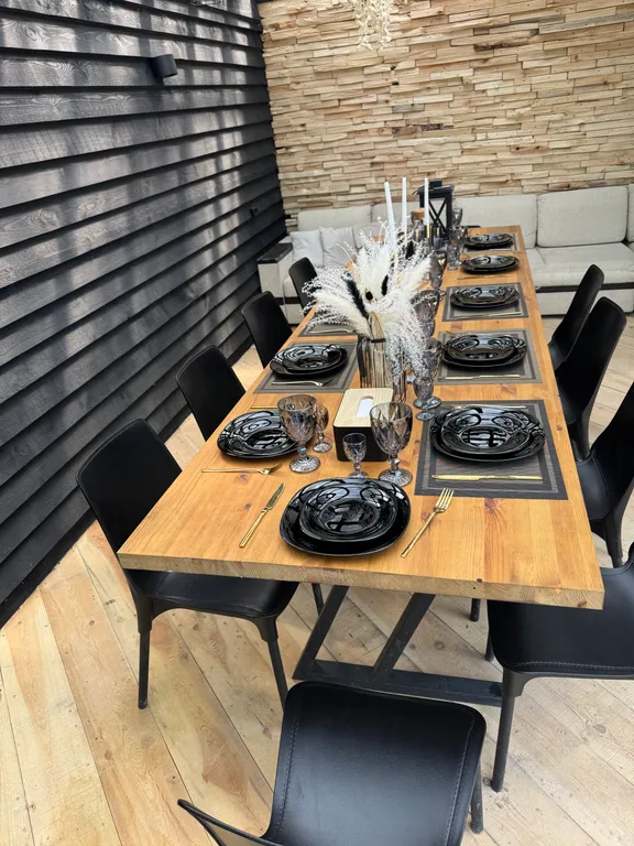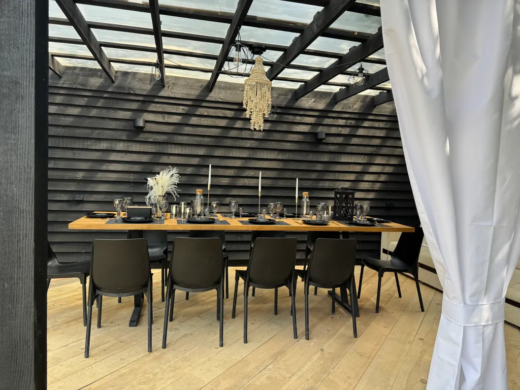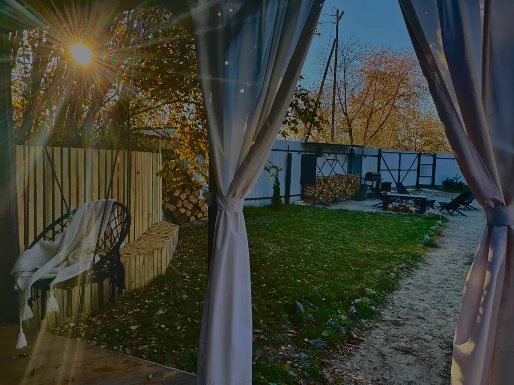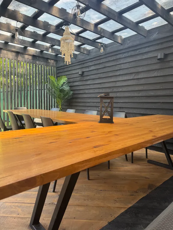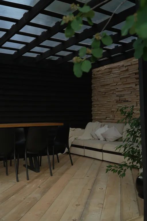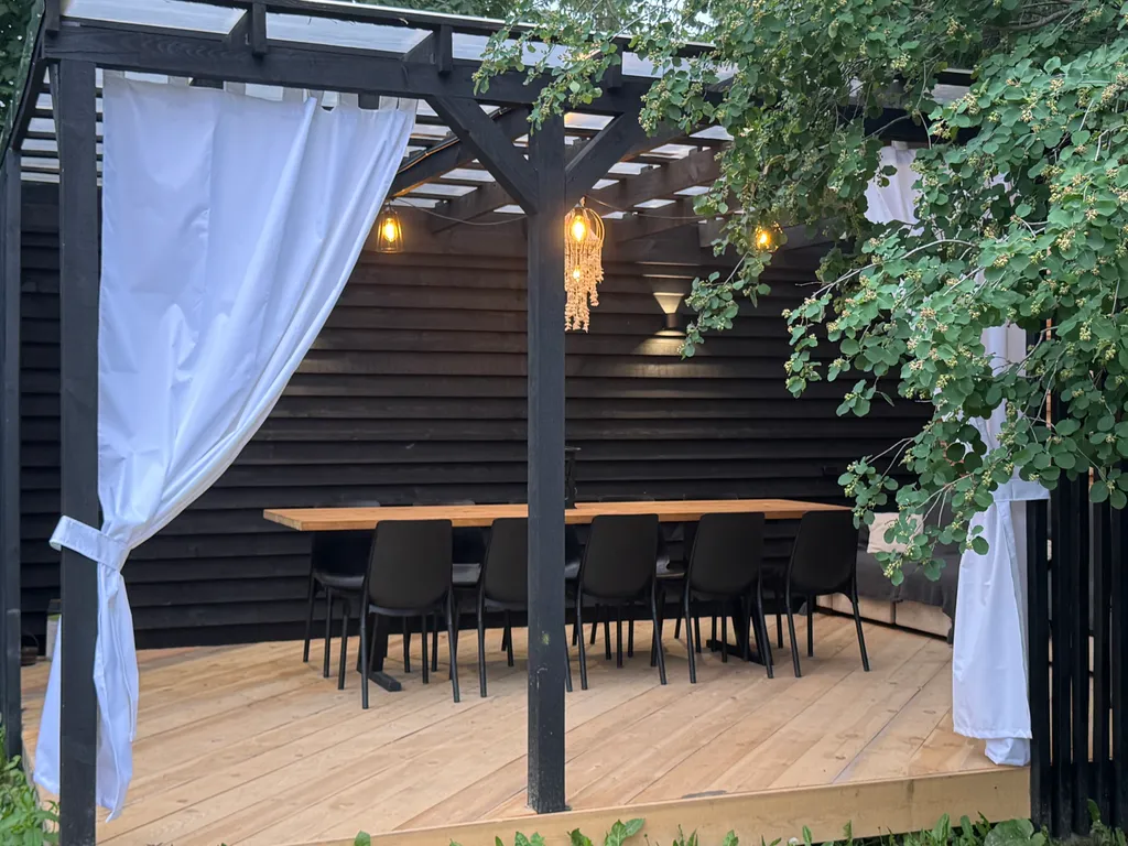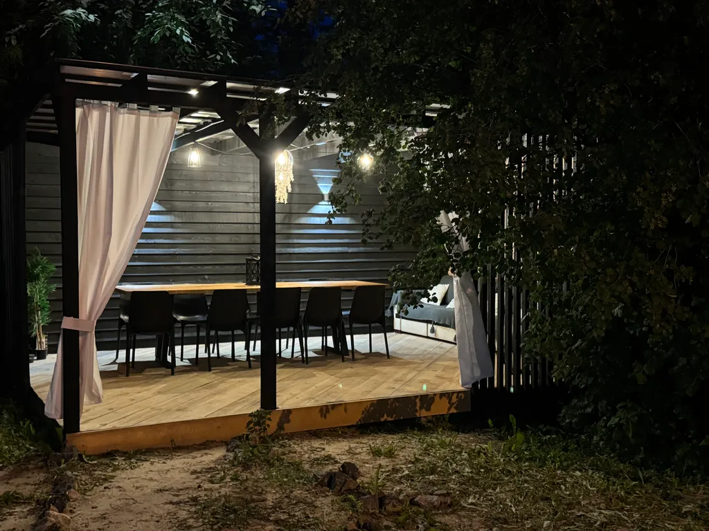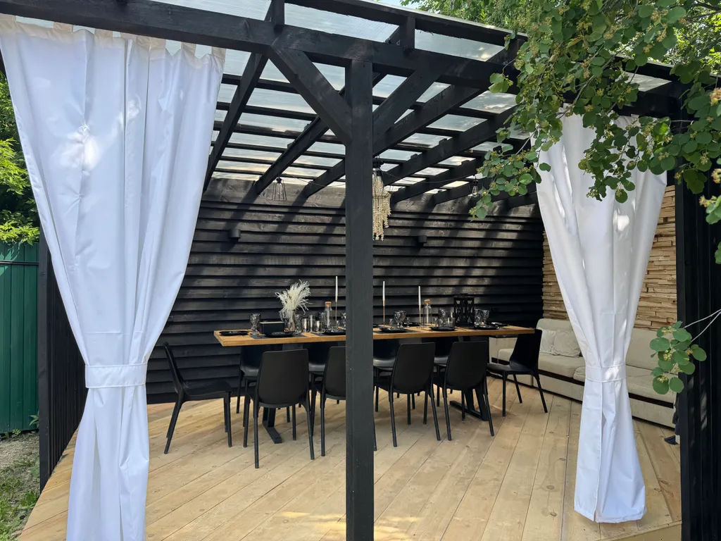 Открытая стильная беседка 4*6 м (большой удобный 4 м диван, два 3 м стола, стулья, розетки, свет, шторы, сухая в дождь).