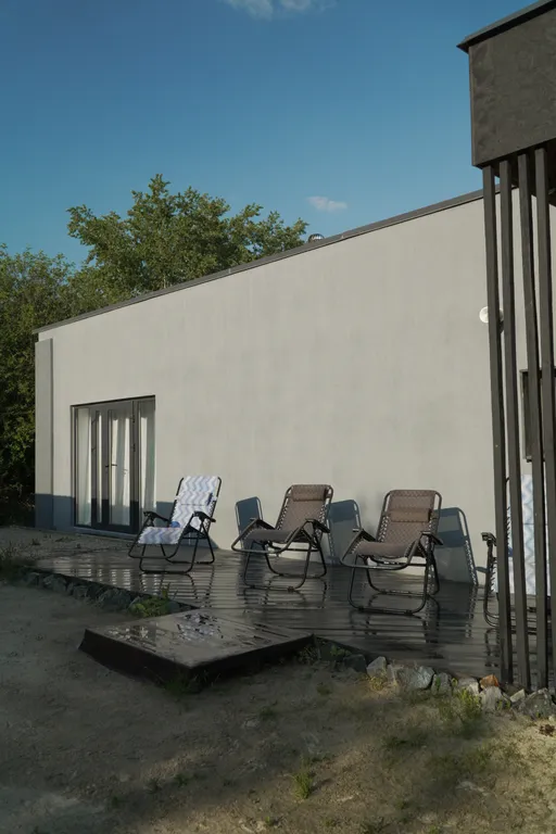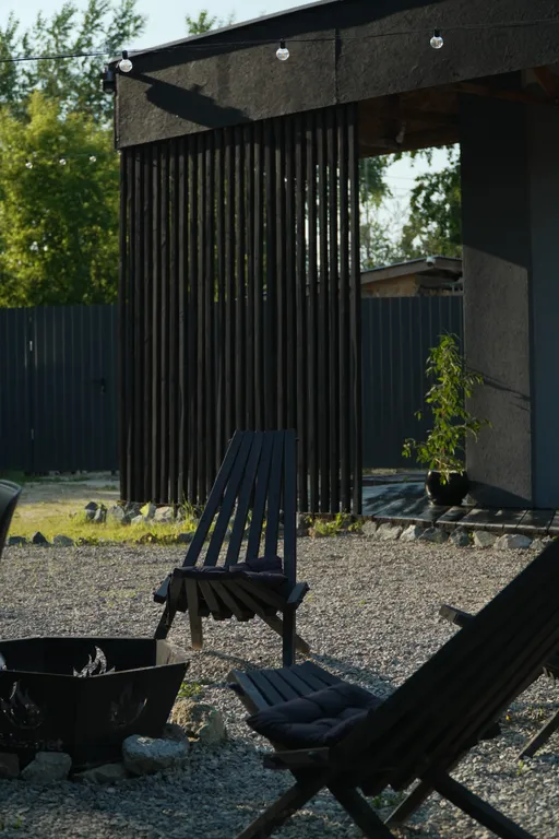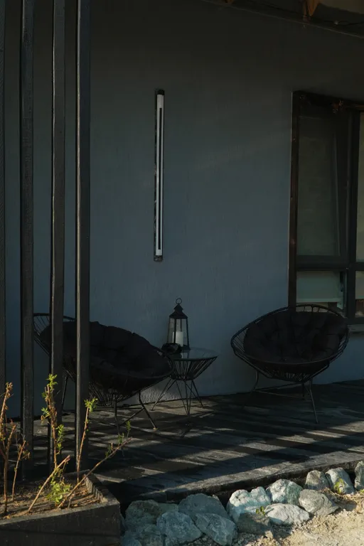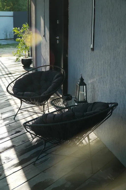 Lounge зона на веранде с мягкими креслами и стеклянным столиком.